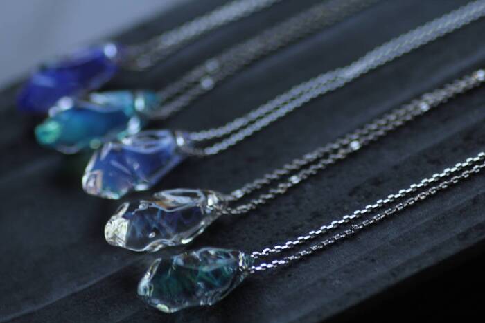 薄い青色のガラス内部に青色の螺旋が入るドラゴンティアーズをはじめ、NEWカラーでは薄いピンクのガラス内部に青白い螺旋が入るユニコーンティアーズや薄い緑のガラス内部に青白い螺旋が入るアージェントグリーン、シルバーフューミングを施して透明ガラス内部に青白い螺旋が入ったタイプ等々出品しておりますのでぜひ実物を見にお越しくださいませ。